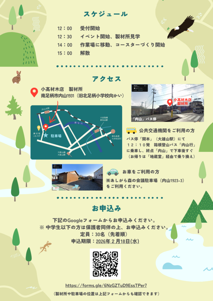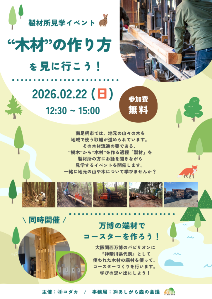当日は製材所見学のほか、大阪万博で使用された神奈川県産材を使った簡単なコースターづくりを行います。